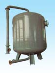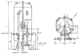 本設備為立式園筒形容器,上、下為橢園形壓制封頭,底部有三個支柱,本體及管道內壁涂有高強度的防腐保護層,設備內部裝有不同顆粒度的石英砂(或無煙煤)過濾材,上部有進水分布裝置;下部有穹形孔板,其上亦裝有壓縮空氣管,可供反洗時松動過濾層之用。外部正面有進水,出水,反洗進水及排水等管導和閥門,亦有進、出水取樣管閥,取樣槽及壓力表裝置。
